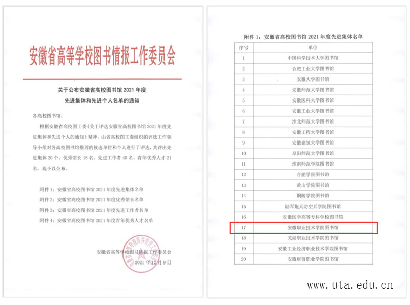 此次年度评选工作由省高校图工委评选工作领导小组组织进行,在全省范围内开展高院图书馆2021年度先进集体和个人评选活动,主要是为了表彰在安徽省高院图书馆事业发展中做出优异成绩的先进集体和个人。我院图书馆为省内5所获此荣誉的高职院院图书馆之一,体现了省图工委对我院图书馆在图书馆事业发展中所做成绩给予的充分肯定和鼓励。