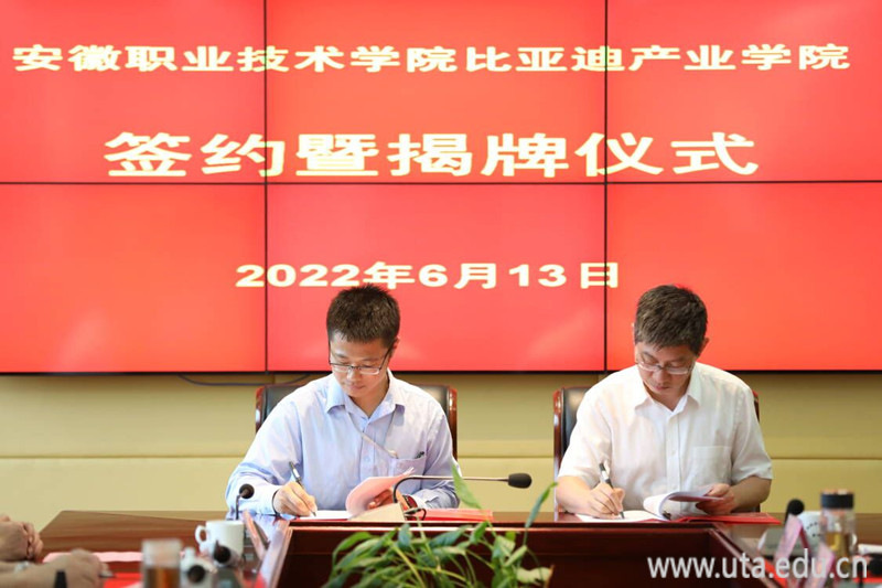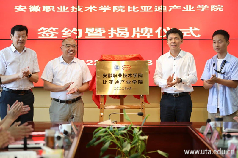 本网讯(汽车工程学院通讯员 邓睿)6月13日上午,安徽职业技术学院与比亚迪汽车工业有限公司在图文信息中心九楼会议室举行比亚迪产业学院签约暨揭牌仪式。长丰县县委书记李命山,长丰县政府副县长王丰长丰县政府副县长、教体局局长陶程,比亚迪公司华东地区人力资源部合肥基地负责人赵鹏勃,合肥基地人力招聘主管李天奇,学院全体领导班子成员出席仪式。长丰县县委办公室、长丰县人社局等部门领导,学院相关职能部门负责人、汽车工程学院党政负责人及部分骨干教师参加仪式。仪式由党委委员、副院长张智清主持。