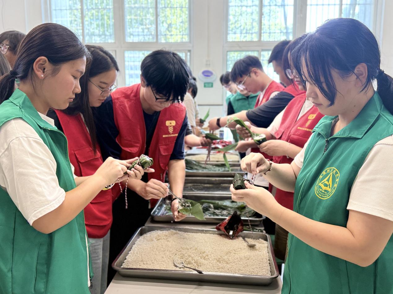 粽叶青青裹思念,糯米粒粒传温情。活动在浓郁的节日氛围中展开,食堂阿姨向青年学子详细演示包粽子的技巧,从粽叶的折叠,到糯米、馅料的填充,再到扎绳定型,每一个步骤都讲解得细致入微。一双双灵巧的手熟练地裹粽叶、填糯米、系绳子,粽叶在师生们的手上不断翻舞,碧绿的粽叶优雅地首尾相拥,将晶莹剔透的糯米缠绕其中。一折叶,一盛米,一缠线,包裹着对美好生活的向往和祝福,不仅是制作美味,更是触摸千年民俗的温度。在师生们的欢声笑语中,理解“端午”二字背后的家国情怀与文化传承。