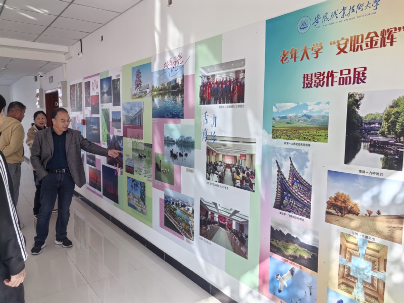 10月23日,第三届“安职金辉”书画摄影作品展在学校老年大学二楼大厅正式展出。部分退休职工、在校学生应邀出席了展览首日的观摩活动。