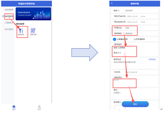 在“维保管理”模块中,点击“报修申请”,依次选择校区、报修类别及宿舍,详细填写报修原因后,点击“提交”按钮,耐心等待维修人员接单并进行维修处理。