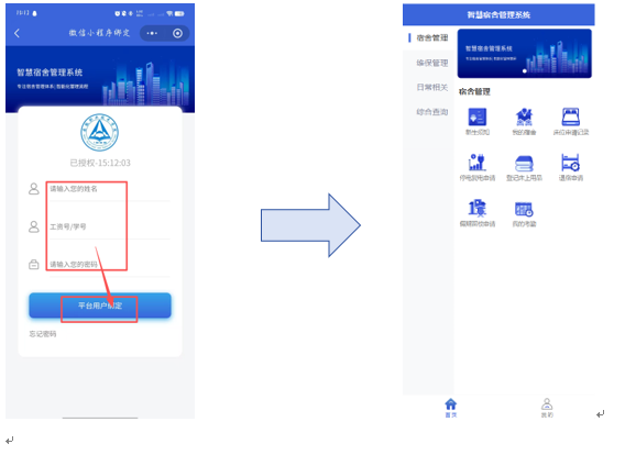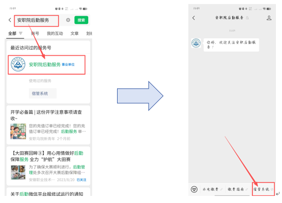 ① 微信搜索并关注“安职院后勤服务”公众号,点击“宿舍管理”,即可进入后勤服务小程序。