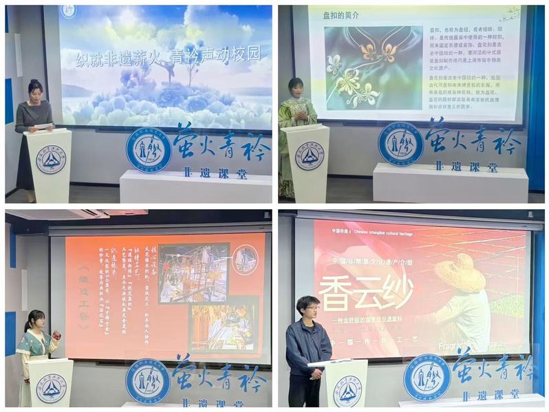 活动现场,“萤火青衿”宣讲团以“云肩—云锦—香云纱—盘扣—苏绣—旗袍”为主线,系统展示了传统服饰非遗技艺的独特魅力。主讲人从李渔(明末清初文学家、戏剧家、戏剧理论家、美学家)“云肩以护衣领”的记载切入,阐释其“装饰与礼仪共生”的文化内涵;通过图像资料生动呈现南京云锦“寸锦寸金”的织造智慧;以“会呼吸的面料”为喻,解读香云纱染整工艺中蕴含的生态理念。