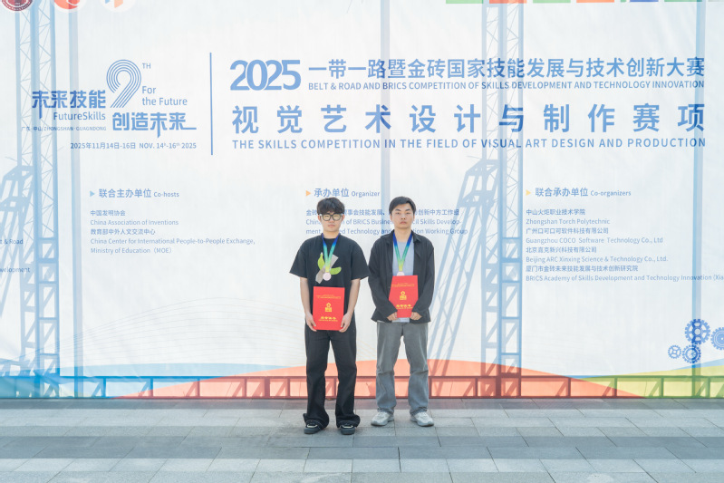 本网讯(艺术与创意学院)11月14至16日,2025“一带一路”暨金砖国家技能发展与技术创新大赛视觉艺术设计与制作赛项全国总决赛在广州中山举行。艺术与创意学院视觉传达设计专业杨承、陶翰文两位同学,从全国151支参赛队伍中脱颖而出,双双斩获国赛三等奖。