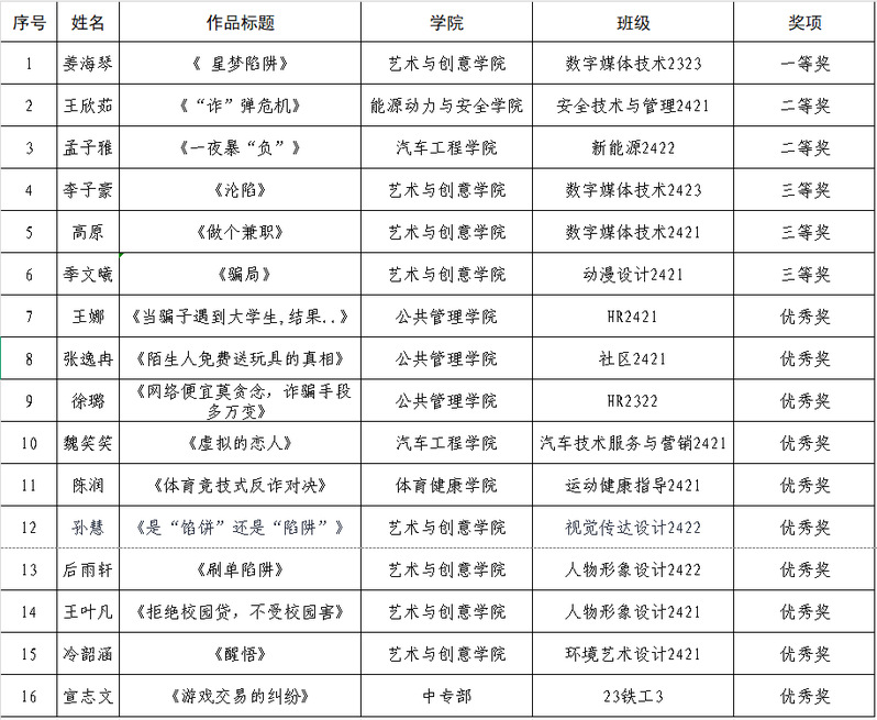 为全面加强学院反电诈宣传教育工作,进一步增强师生的反诈意识和识骗能力,根据上级相关文件要求,学院组织师生参加第二届全省反电诈短视频大赛作品征集活动,本次活动共收到应征作品40余件。经评委会评审,评选出一等奖1名,二等奖2名,三等奖3名,优秀奖10名。现将获奖名单公布如下: