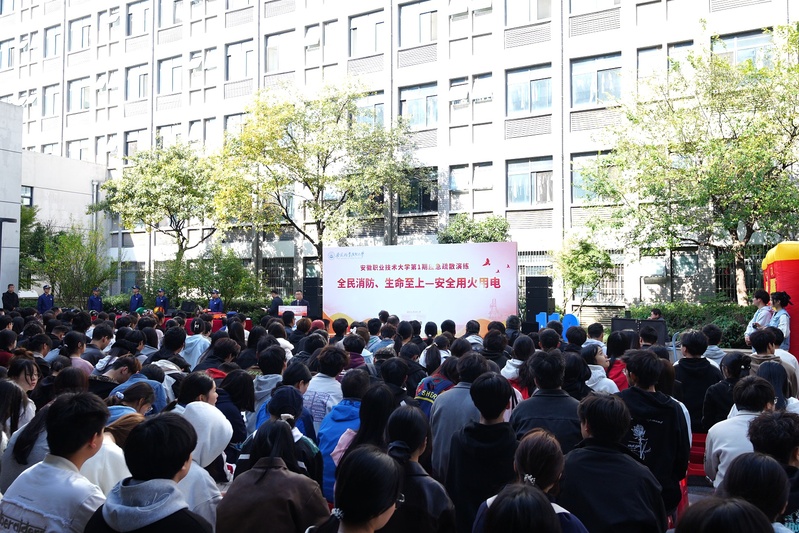 为进一步树牢安全发展理念,切实提高师生消防安全意识和应急避险能力,坚决守住安全底线,11月12日,76net必赢线路检测中心第1期应急疏散演练在韶华园成功举行。学校党委委员、副校长宣岩松出席活动,合肥市新站高新区消防救援大队新海救援站队长曾燮、安徽省正平消防工程有限公司总监陈德升,学校相关职能部门负责人、各二级学院党总支负责人、团总支书记及辅导员代表、学生代表共计800余人参加活动。