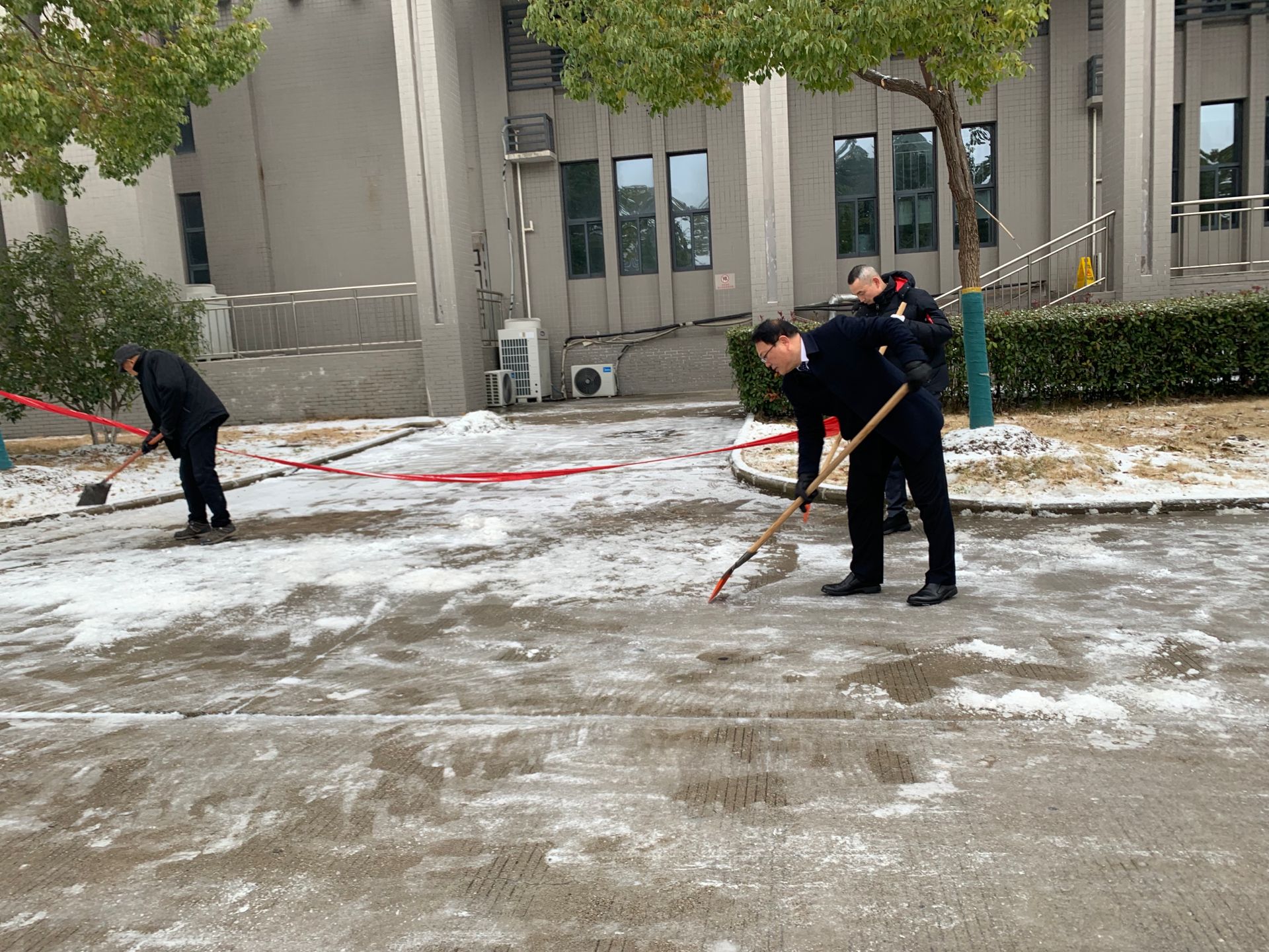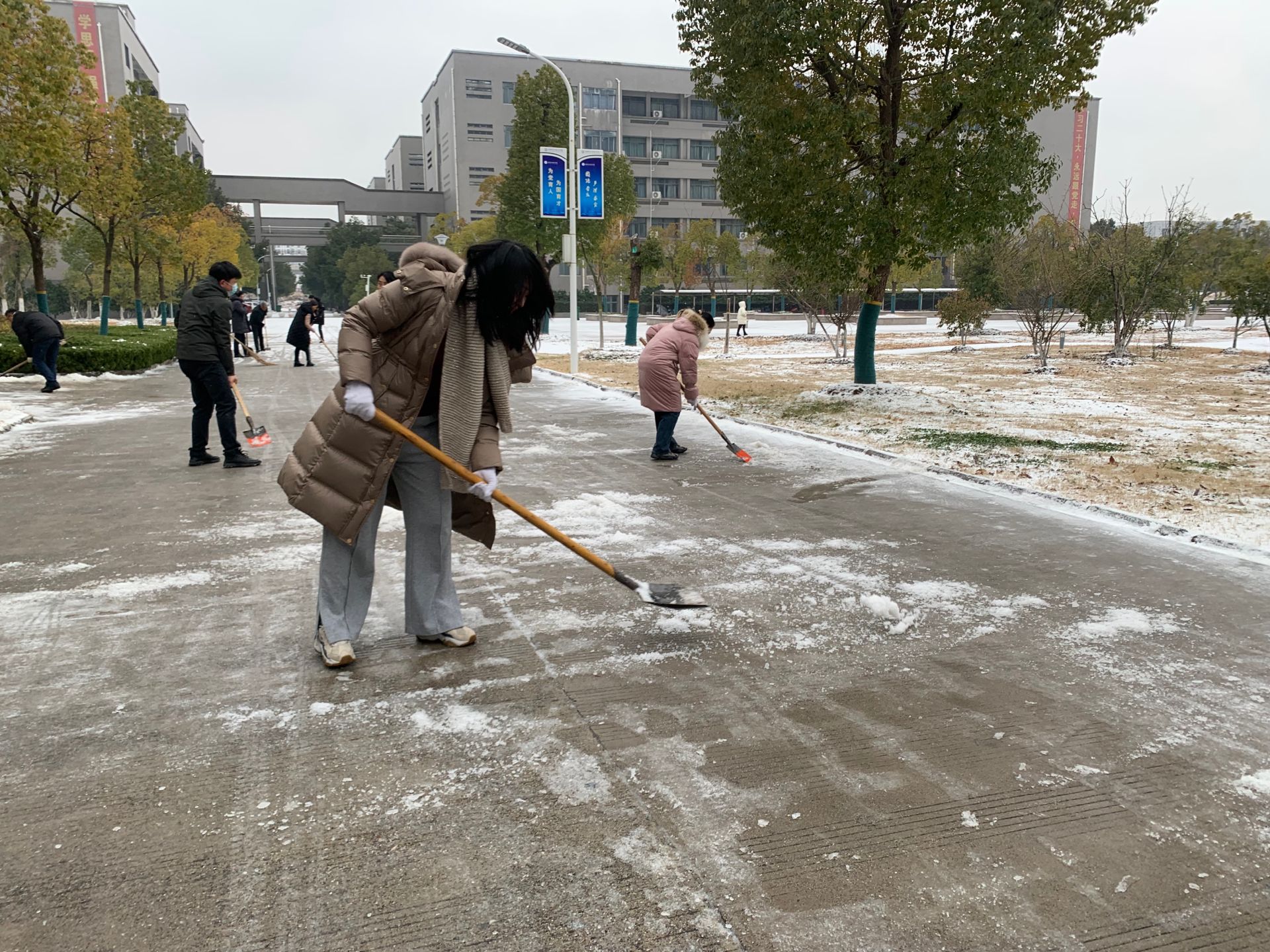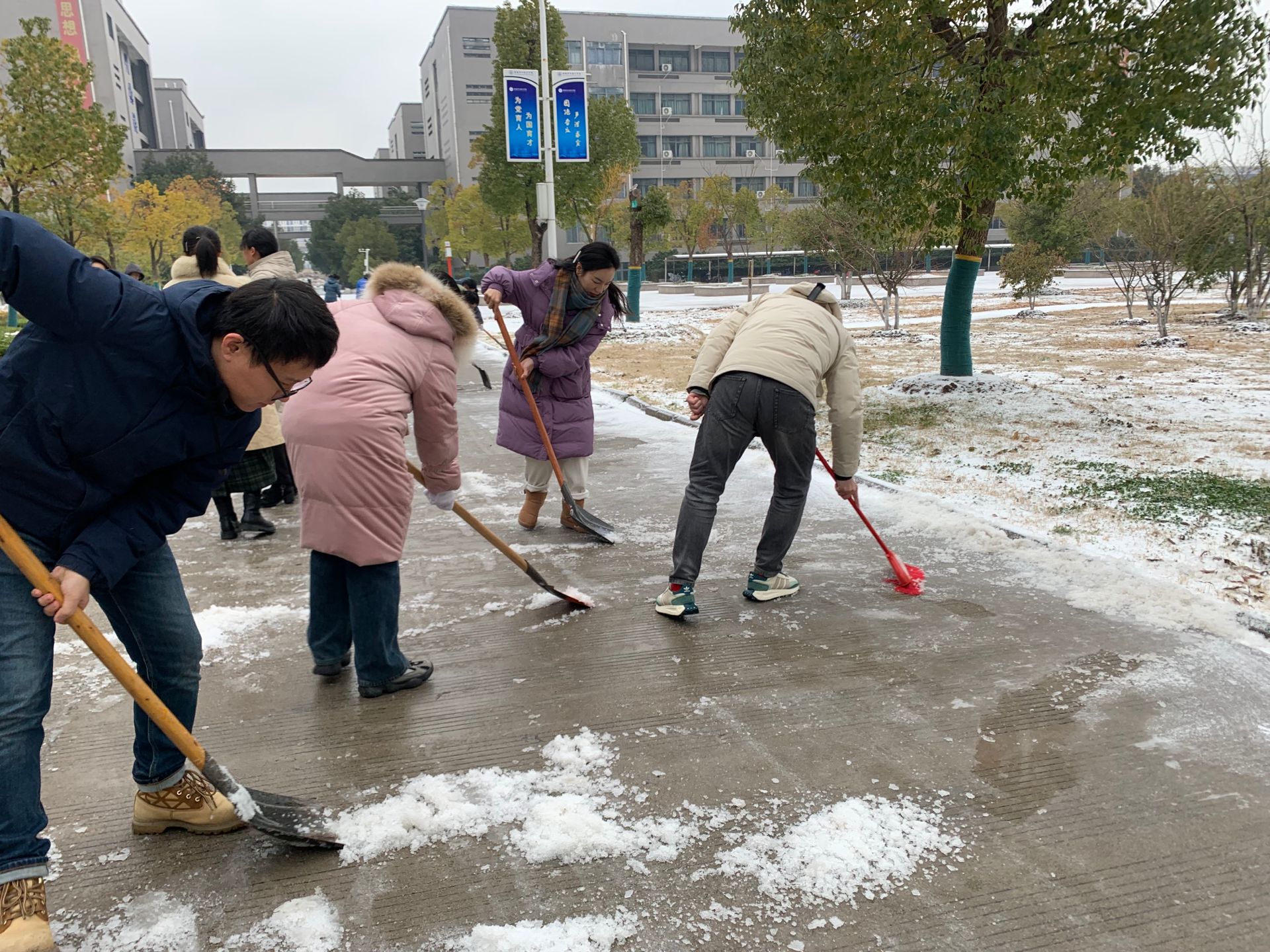 至立会堂西侧主干道上,财务处工作人员和学院其他部门工作人员充分发扬不怕苦、不怕累的精神,默契配合,有条不紊地疏雪、铲雪、扫雪、融雪,齐心协力清理结冰路面,忙碌的身影在冬天凛冽的寒风中构成了一道靓丽的风景线。经过两个多小时的奋战,主要道路上的积雪基本清扫干净,为师生出行清扫出一条“绿色通道”,为召开新学期教职工大会和即将返校的学生们营造了一个干净畅通、整洁安全的环境。