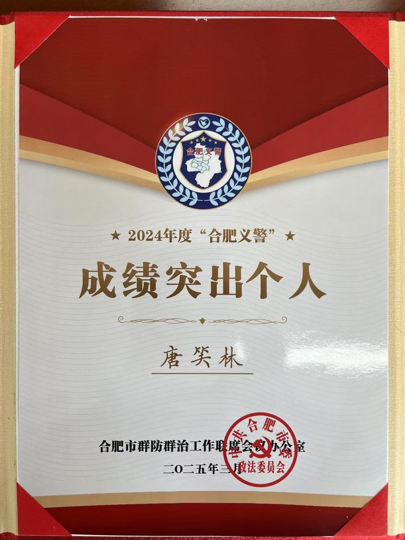 近日,合肥市群防群治工作联席会议办公室与政法委员会联合发布2024年度“合肥义警”表彰名单。安徽职业技术学院财务处处长唐笑林同志凭借在社区巡逻防控、安全宣传工作中的卓越表现,荣获“成绩突出个人”称号。