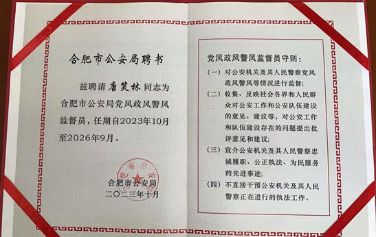 聚是一团火,散是满天星。在未来的日子里,作为合肥市公安局党风政风警风监督员的唐笑林同志将在各级领导的关心和支持下,在广大市民的理解和信任下,以更加饱满的热情、更加坚定的信念,投身到义警事业中去,做到宽严相济、法理情相融,着力提升义警工作人性化水平,让义警工作既有力度更有温度,用实际行动为平安合肥、幸福安徽作出新的更大贡献!