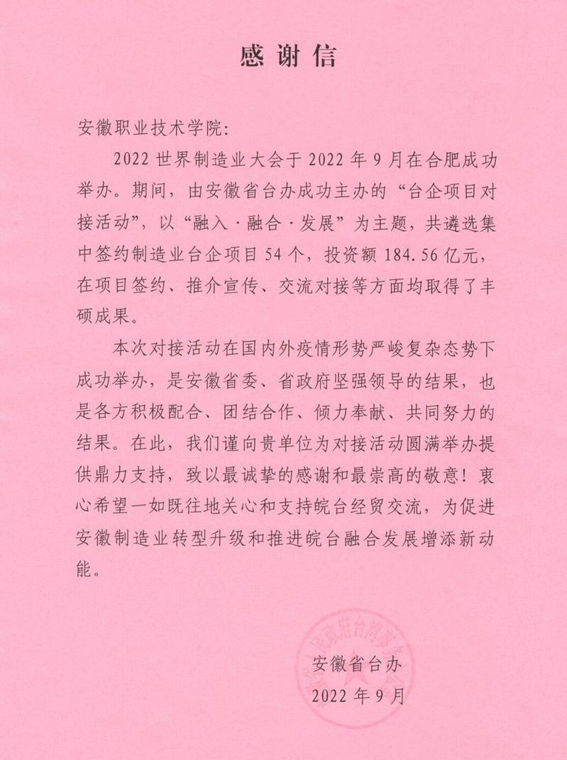 信中表示,在2022世界制造业大会上,由安徽省台办成功主办的“台企项目对接活动”,以“融入·融合·发展”为主题,共遴选集中签约制造业台企项目54个,投资额184. 56亿元,在项目签约、推介宣传、交流对接等方面均取得了丰硕成果。在此,向我院为对接活动圆满举办提供鼎力支持,致以最诚挚的感谢和最崇高的敬意!并衷心希望我院一如既往地关心和支持皖台经贸交流,为促进安徽制造业转型升级和推进皖台融合发展增添新动能。