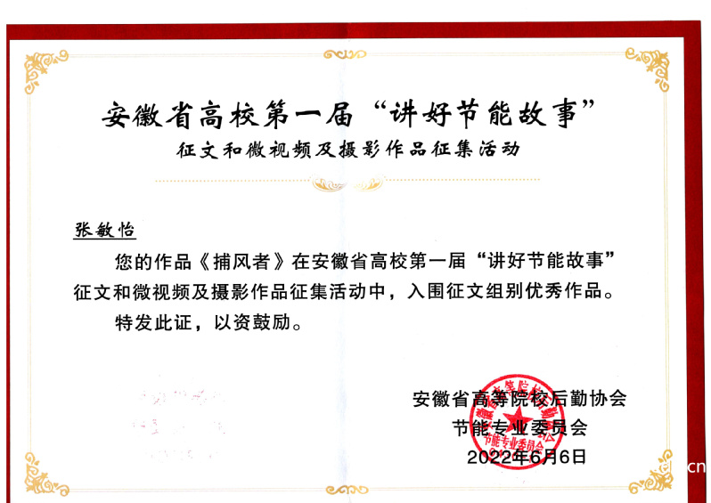 启动仪式上,安徽省高等院校后勤协会节能专业委员会对在节能工作中表现优异的单位和个人进行颁奖,我院学子张敏怡的作品《捕风者》获得安徽省高校第一届“讲好节能故事”征文和微视频及摄影征集优秀作品奖。