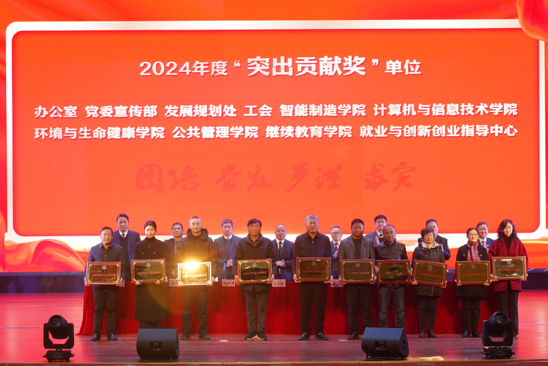 本网讯(办公室)为贯彻落实省委“新春第一会”精神,总结回顾学院2024年主要工作,全面部署2025年重点工作,2月15日,学院以“真抓实干往前赶 团结奋进启新程”为主题,隆重召开2025年全校教职工大会暨“团结奋进年”动员会。学院领导班子成员出席会议,各部门、各二级学院教职工代表及学生代表800余人参加会议。会议由党委委员、副院长张智清主持。