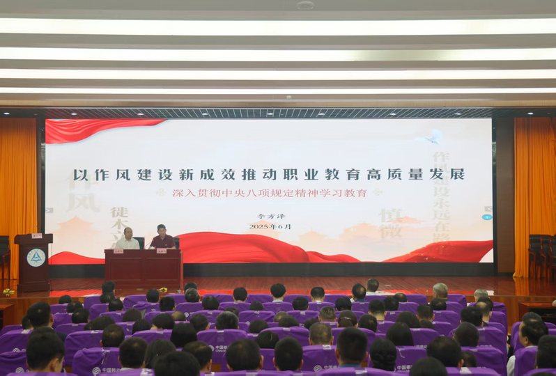 (党委组织部)为进一步推进深入贯彻中央八项规定精神学习教育走深走实,切实将学习成果转化为推动学校高质量发展的实际行动,6月23日,党委书记李方泽围绕“以作风建设新成效推动职业教育高质量发展”主题,为全校师生党员讲授作风建设专题党课。全体中层干部、组织员、党支部书记、思政课教师、专职辅导员、发展对象代表、学习教育专班成员共计360余人参加学习。党课由党委副书记杨林国主持。