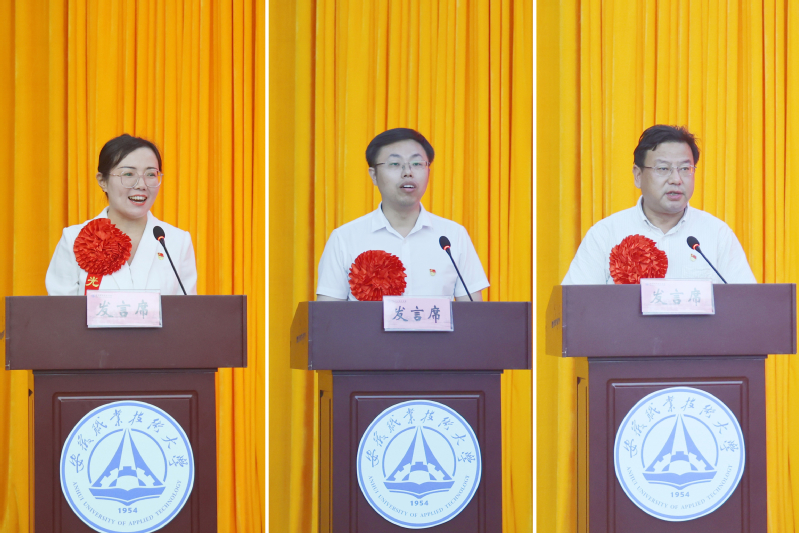 优秀共产党员代表、现代商务学院教师崔巍巍,优秀党务工作者代表、建筑工程学院教师孟飞龙,先进基层党组织代表、机关党委办公室党支部书记吕时礼等3位同志作了交流发言。他们结合自身经历,分享了在教学科研、党建带团建、行政处室工作中的感悟与担当,充分展现了党员的先锋模范风采。