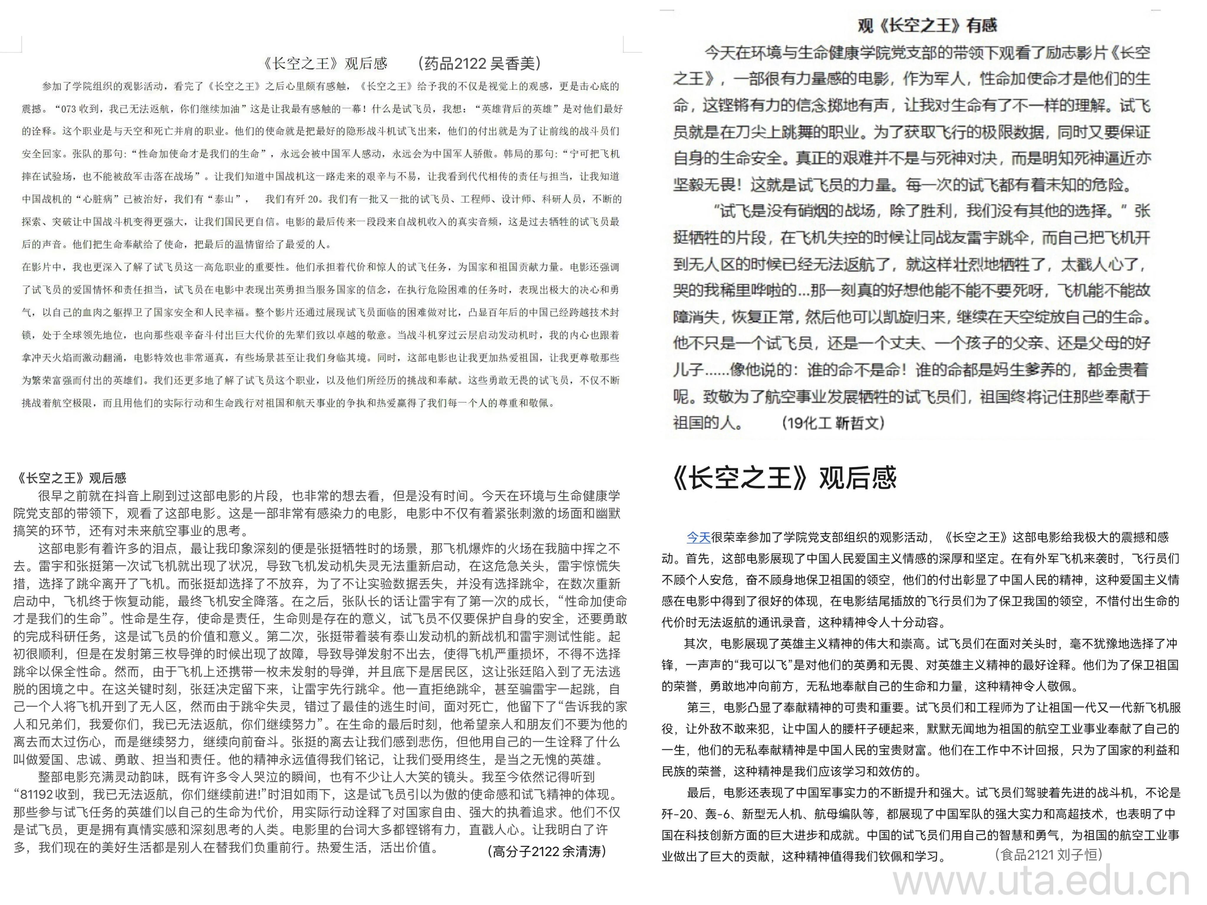 观影结束后,青年学子纷纷发表感悟,包奥林表示,“功成不必在我”是老一辈试飞员无私无畏的奉献精神,“功成必定有我”是新一代试飞员敢闯敢拼的冒险精神,祖国终将记住那些奉献于祖国的人,祖国终将选择那些忠诚于祖国的人。邹可新表示,“祖国的和平与安全来之不易,在捍卫国家主权和领土完整的背后有无数人在负重前行,庆幸我们生在河清海晏的和平年代,庆幸我的青春里有迷彩的颜色,更庆幸无论身在何方,身后都有伟大的祖国给我们自信和力量。”