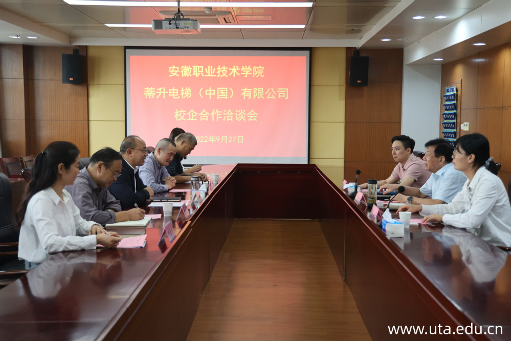 (发展规划处通讯员 王炎)9月27日下午,学院与蒂升电梯(中国)有限公司在图文信息中心十楼会议室举行校企合作洽谈会。蒂升电梯(中国)有限公司中国区CEO特别助理李开旗等莅临会议,学院党委书记李方泽出席会议,发展规划处、智能制造学院、就业与创新创业指导中心以及办公室的有关负责同志参加会议。会议由发展规划处处长洪应主持。
