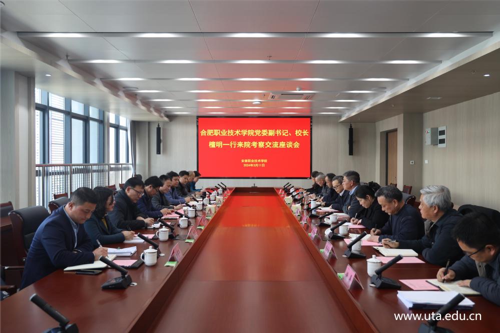 (发展规划处通讯员 汪洁)3月11日,合肥职业技术学院党委副书记、校长檀明一行来我院考察并座谈交流,学院领导盛鹏、杨林国热情接待了檀明一行,相关部门负责人参加了座谈会,会议由党委副书记、院长盛鹏主持。