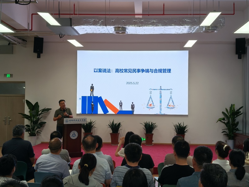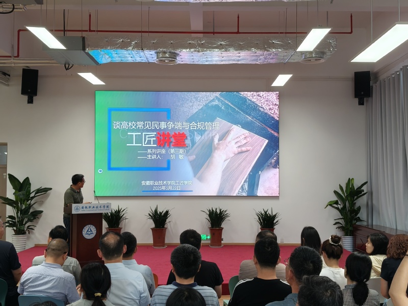 本网讯(党委宣传部 工会 发展规划处)以第五个“民法典宣传月”为契机,为深入贯彻落实依法治校要求,学习贯彻党的二十届三中全会精神和习近平法治思想,以法治建设提升治理体系和治理能力现代化水平,推动学院高质量发展,同时提升教职工法律风险防范意识和合规管理能力,5 月 22 日下午,工匠学院成功举办了“以案说法:高校常见民事争端与合规管理”为主题的民法典专题学习讲座。学院党委副书记、院长盛鹏,各部门、各二级学院党政负责人及法治联络员参与讲座。活动由学院党委宣传部、工会和发展规划处共同承办。