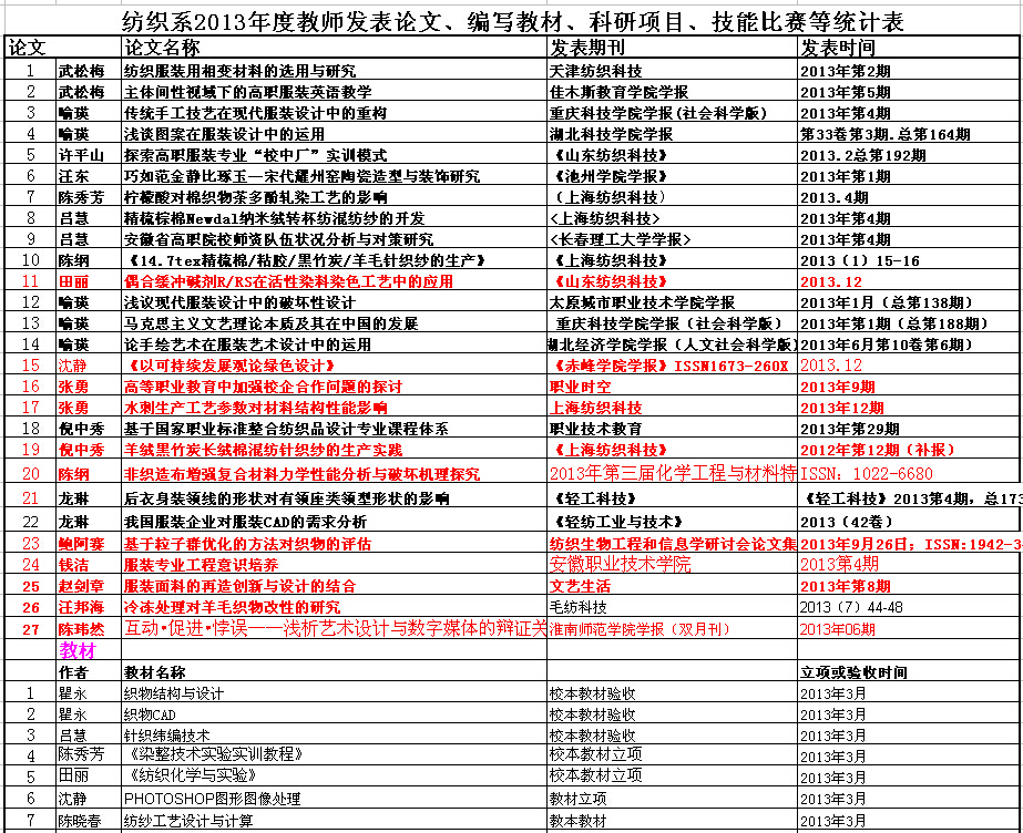 纺织系2013年度教师发表论文、编写教材、科研项目、技能比赛等统计表