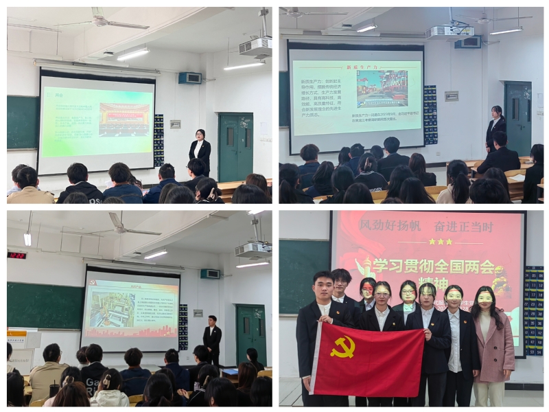 会上,六位同学以全国两会中的热点词汇为切入点,从经济建设、社会民生、文化教育、生态文明等方面带领同学们展开学习。服设2222班张咪哪说:习近平总书记在今年全国两会期间强调,要牢牢把握高质量发展这个首要任务,因地制宜发展新质生产力。作为大学生的我们要秉承新时代的使命,紧紧抓住机遇,砥砺前行,注重创新能力和实践能力培养,时时关注社会热点,切实提高自身综合素质和竞争力。服工2222班张浩然说:2024年政府工作报告特别提到“预计今年高校毕业生超过1170万人,要强化促进青年就业政策举措,优化就业创业指导服务”。我切实感受到了党中央对青年大学生的关心关爱,对高校毕业生就业工作的重视。我将继续专心理论知识学习,不断提高专业技能和素养,服务社会,为实现中华民族伟大复兴贡献自己的力量。