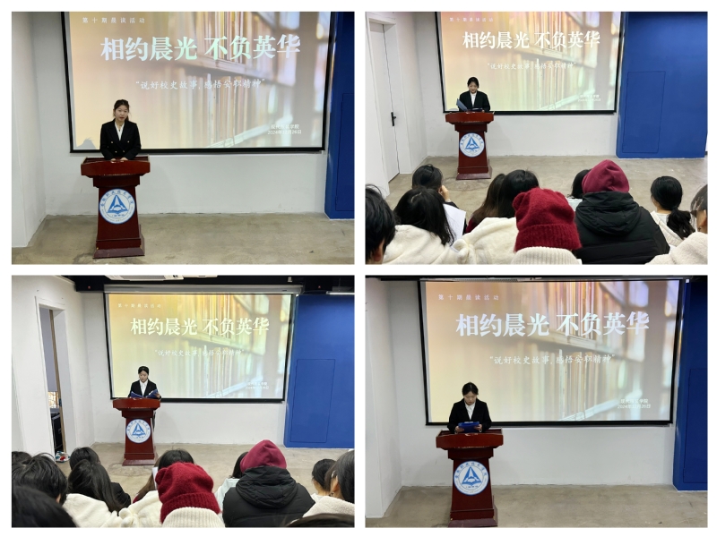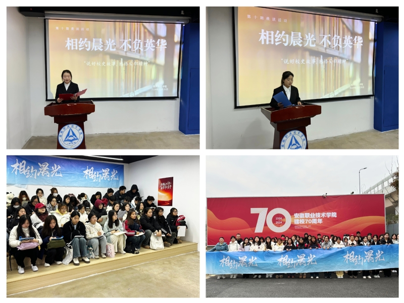 本次晨读以“说好校史故事,感悟安职精神”为主题。活动中,纺织2321班孙诗铭同学向大家分享了自己担任校史馆讲解员期间的所思所想,她说到,校史馆的一幅幅照片,一帧帧回忆,让我们有机会共同探索安职走过的70年辉煌历程,凝聚了师生的团结与进步,蕴藏着学校的精神与力量。检验2421班张梦同学谈到,有幸在校庆系列活动中担任志愿者,在服务中听到毕业多年的“学长学姐”诉说校园青春故事,感激恩师教诲与期望,自豪母校发展与变化,内心满满的都是收获和成长。服工2421班储静向同学们讲述了自己参加学院建校70周年高质量发展论坛的震撼和收获,全省60多所高职高专校领导来到安职,一同聆听高规格讲座,一同见证安职的日新月异,倍感自豪。服工2421班袁熠介绍了现代服装学院与学校共同走过的七十年光阴故事。