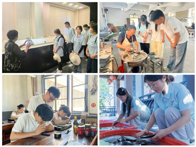 “静”线引领团队走进百年胡开文墨厂与徽州歙砚博物馆。松烟缭绕的制墨车间里,学子们屏息凝神,观摩古法制墨的繁复工序,体悟“轻胶十万杵”中沉淀的千年匠心。博物馆内,形态万千的歙砚无言诉说着“石不能言最可人”的境界。同学们执笔细描砚上纹饰,每一笔都是对“静中匠心”的虔诚摹写。深度对话徽墨国家级传承人周洪美、歙砚省级传承人胡水仙,大师们坚守一生的故事,让抽象的“传承”化为血肉丰满的精神火炬,照亮青年前路。