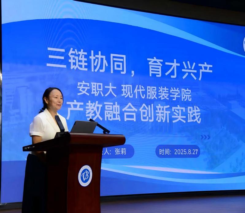 现代服装学院副院长张莉在会上作题为《三链协同,育才兴产——安职大现代服装学院的产教融合创新实践》的主旨报告,系统介绍了学院在教育链、产业链、创新链“三链协同”方面的探索与成果。她指出,学院积极践行产教融合发展理念,聚焦课程改革、师资建设、科研平台搭建和校企合作,构建了“真题真做、双岗互聘、平台赋能”的育人模式,推动人才培养与产业发展同频共振。近年来,学院学生就业率保持在95%以上,专业竞赛和科研创新成果显著,产教融合效能不断凸显。