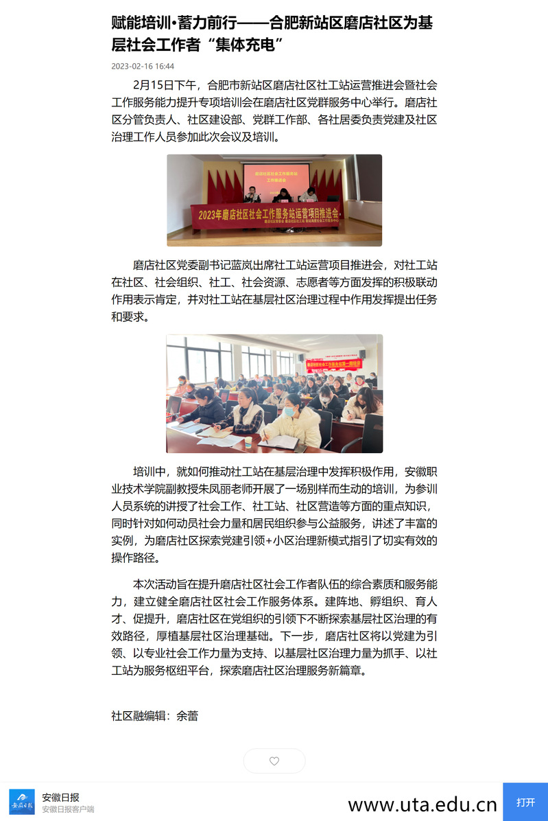 2月16日《安徽日报》新媒体客户端、《安徽新闻网》以“赋能培训•蓄力前行——合肥新站区磨店社区为基层社会工作者‘集体充电’”为主题,对“安职院”公共管理学院专业教师朱凤丽受邀为社区基层工作者开展培训工作进行报道。
