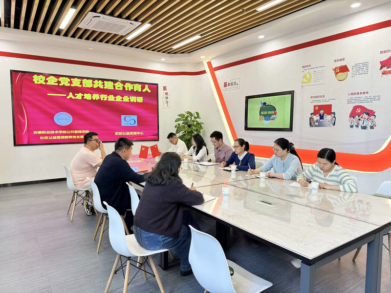 调研活动中,在合肥市庐阳区实创公益发展中心高志强主任等人的陪同下,参观了庐阳区党群服务中心,并重点围绕“人才培养、课程共建、实践教学、社会服务、课题联合攻关”等议题展开研讨,推动校企协同育人。