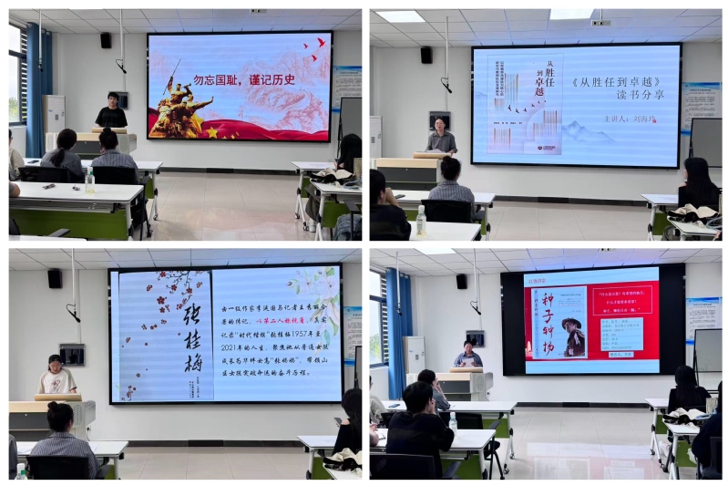 在学生分享环节,学生党员吴锦以《九一八》一书为切入点,条理清晰地梳理历史脉络,带领大家直面“九一八”事变的真相,让在场每一位听众更深刻地理解那段苦难历史的沉重分量;入党积极分子马文君同学分享《南京大屠杀》,用书中翔实的史料与沉重的文字,提醒众人铭记历史伤痛,珍惜当下和平,现场氛围庄重而肃穆。随后,入党积极分子屈雯雯分享《时代楷模张桂梅》,通过讲述张桂梅校长扎根山区教育、点亮女孩梦想的事迹,展现不同时代背景下女性坚韧不拔的力量,引发观众强烈共鸣;张小月同学再次聚焦张桂梅的故事,以《张桂梅》一书为依托,进一步挖掘楷模精神的内涵,让“无私奉献、坚守初心”的品质成为激励在场青年前行的精神灯塔。