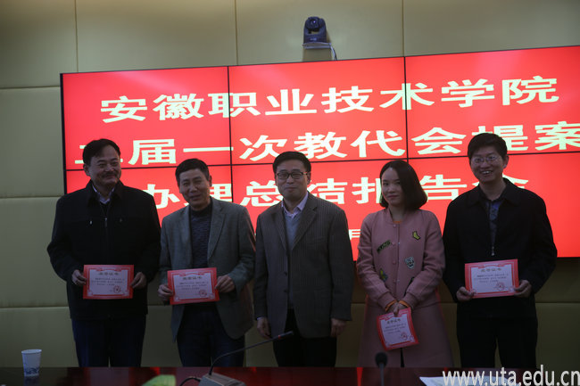 会上,院教代会执委会副主任、民主评议和监督工作委员会主任张在腾宣读了学院《关于表彰优秀提案及提案落实优秀部门的通知》的文件。文件决定,“关于在教学楼与实验楼之间的道路上建立文化长廊的提案”等5件提案被评为优秀提案,对提案者及提案部门予以表彰和奖励;教务处、党委宣传部、院办公室等3个提案办理部门被评为提案落实优秀部门并进行表彰。徐振轩为优秀提案作者颁发了奖状及纪念品。