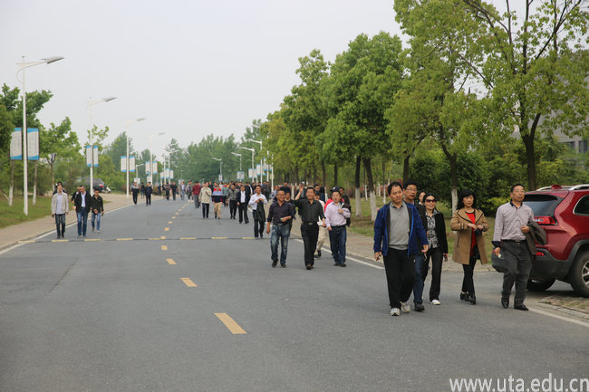教职工们在学院西门起点集合、留影,一番简单的热身后,健身走活动正式开始。大家昂首阔步,意气风发,沿着校园环路欢快健走,从西门旗杆处出发,途径南大门,延环路至东门,再到达行政楼下。暖暖的阳光洒满校园,清新的空气夹杂着香樟树特有的芬芳迎面扑来,佳木繁秀、绿草如茵,校园美景尽收眼底。大家一路欢声笑语,尽情地享受着运动的乐趣,欣赏美景的同时,也增近了彼此间的情感交流。