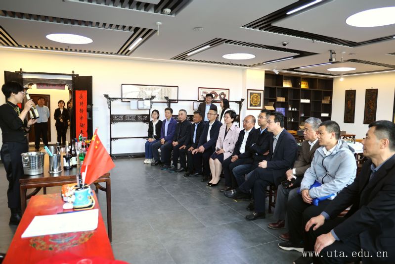 随后,郑晋平等一行先后参观了剪纸馆、戏曲馆、傩文化馆、徽韵学堂等7个馆。在徽韵学堂,文化与旅游学院酒店专业教师韩玮玮现场讲解并调制了融合中西方文化的“贵妃醉酒”鸡尾酒,在茶文化馆,文化与旅游学院酒店管理专业2名学生带来传统的茶艺表演。