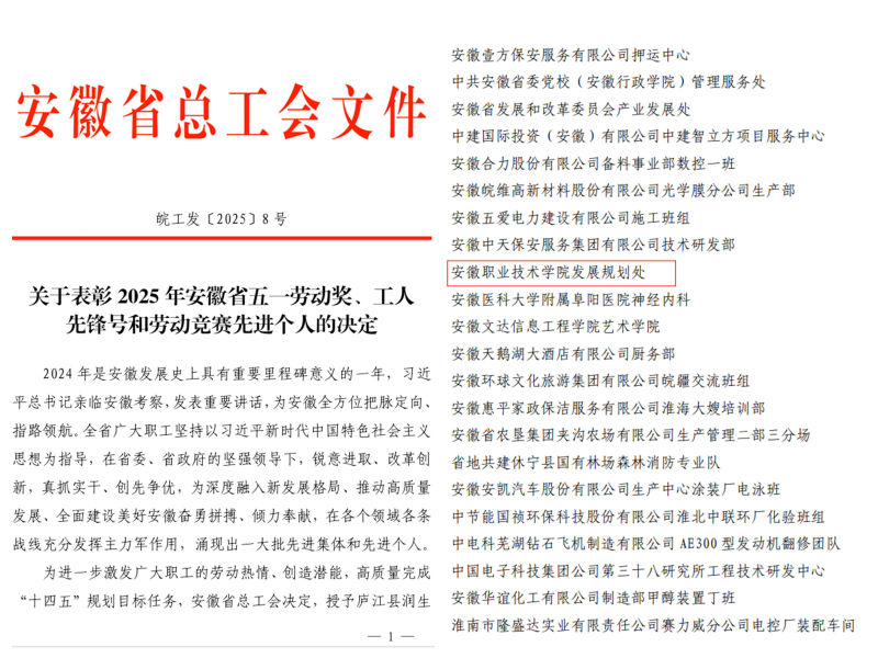 本网讯(工会)“五一”劳动节期间,安徽省总工会发布《关于表彰2025年安徽省五一劳动奖、工人先锋号和劳动竞赛先进个人的决定》。学院发展规划处荣获“安徽省工人先锋号”荣誉称号。