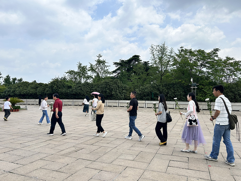 伴随着悲怆的乐声,大家来到了雨花台烈士纪念碑前。烈士纪念碑高42.3米,寓意南京在1949年4月23日解放,邓小平同志题写的“雨花台烈士纪念碑”八个大字在旭日的照耀下,熠熠生辉。同志们神情肃穆,拾级而上,向雨花台英烈敬献鲜花,朵朵白菊,不仅表达着我们对先烈们的追思与悼念,也象征着我们对先烈们高洁品格的瞻仰与倾佩。