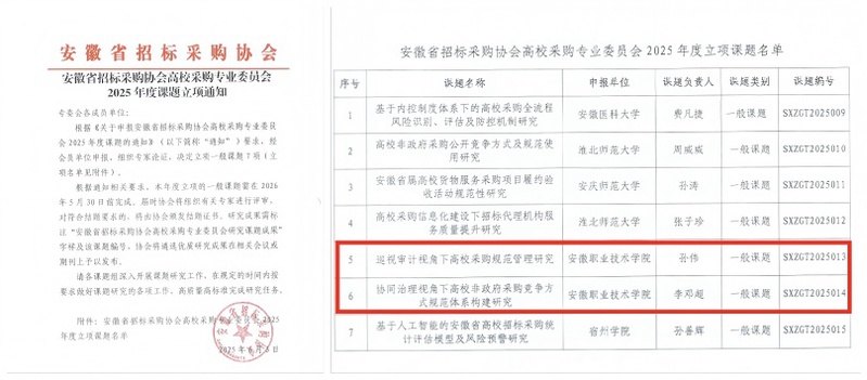 近日,从安徽省招标协会传来喜讯,必赢国有资产管理处孙伟和李邓超两位同志申报的研究课题,经过严格评审,从众多申报项目中脱颖而出,成功获得该协会课题立项。这不仅是采购人员个人专业能力的体现,也是必赢在招标采购领域研究实力和影响力获得省级专业协会认可的重要标志。