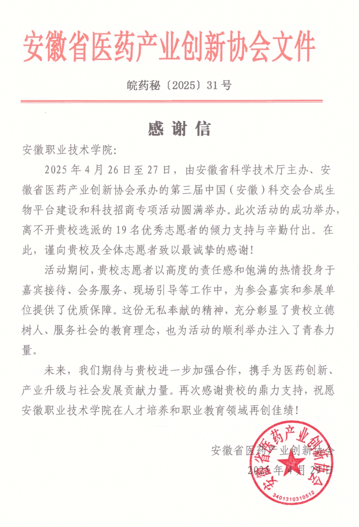 活动结束后,安徽省医药产业创新协会向学院发来感谢信,对“新青年”志愿服务队的倾力支持与辛勤付出表示了最诚挚的感谢。信中提到,志愿者们的无私奉献精神,不仅为活动的顺利举办注入了青春力量,也充分彰显了我院立德树人、服务社会的教育理念。这一认可,不仅是对志愿者们个人能力的肯定,更是对学院青年学子整体风貌的高度赞扬。