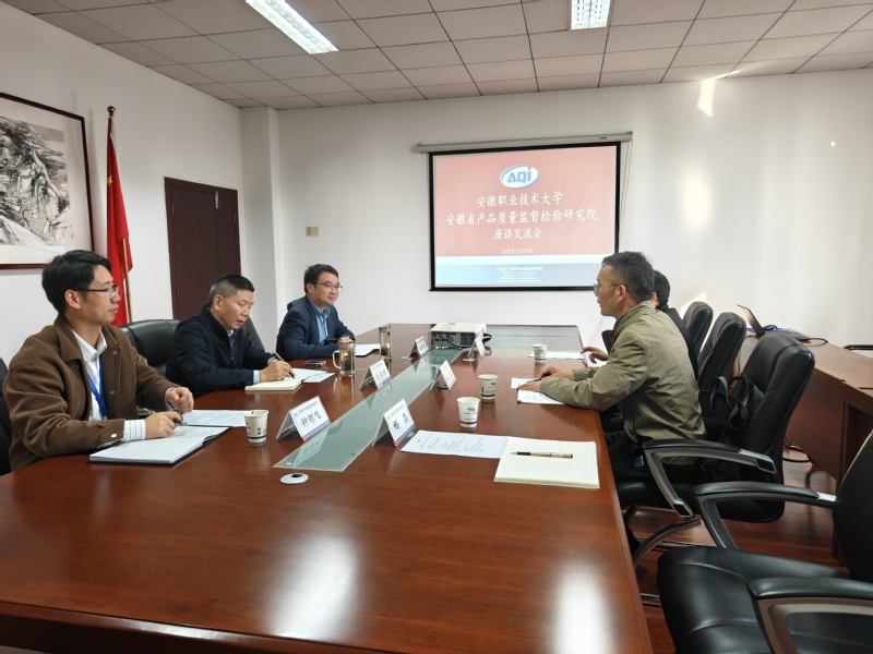 随后,双方举行了座谈会。会上,安徽省产品质量监督检验研究院副院长朱双四热烈欢迎一行人到访,并介绍了安徽省食品产业现状与企业人才需求。刘磊对研究院的热情接待表示衷心感谢,并介绍了学院办学特色与食品专业人才培养成果,表示此次旨在依托研究院平台推动产教资源对接、人才培养方案优化等方面合作。交流期间,双方围绕食品质量安全教育、科研合作以及人才培养等议题深入探讨,凝聚合作共识。