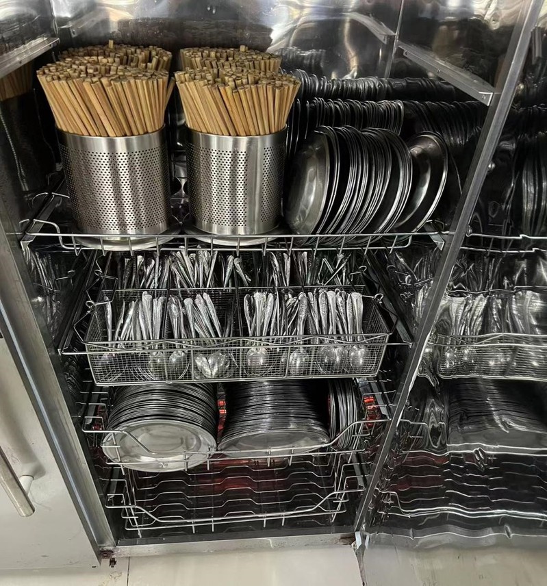 2、餐盘回收后严格执行“一冲、二洗、三清、四消毒”的原则进行操作,清洗干净的餐盘先经过洗碗机消毒后,再放消毒柜二次消毒后妥善存放至开餐前待用。竹筷、不锈钢餐勺洗干净沥水后分拣(筷头朝上,勺柄朝上)后放入消毒柜,采用远红外线与电热烘干相结合的方法进行消毒。