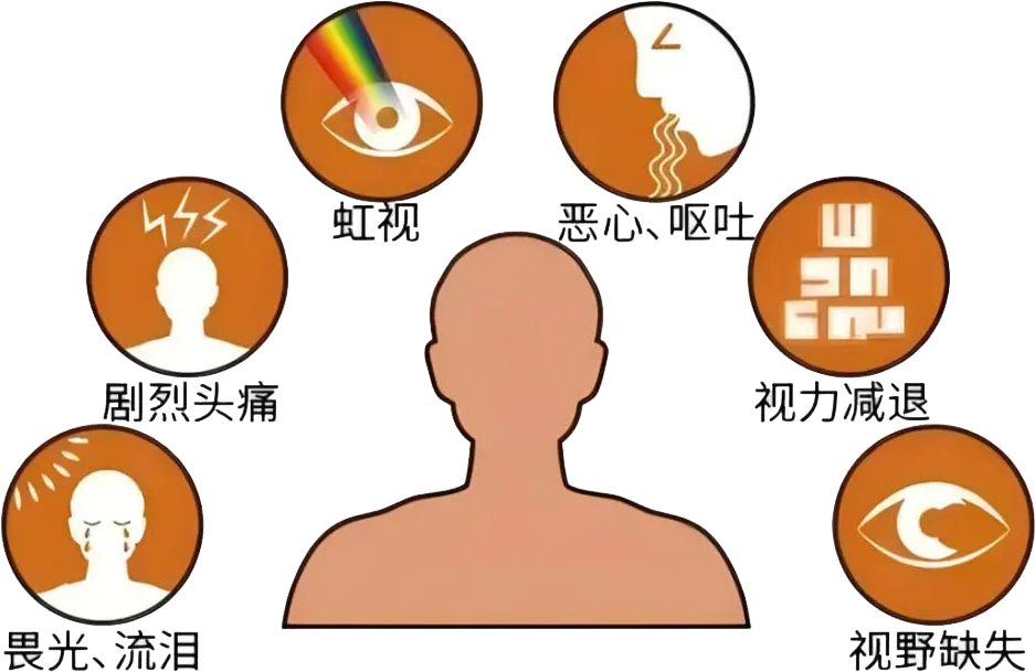 剧烈眼痛伴头痛、恶心呕吐,视力骤降。
