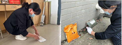 本次行动采取“外围环境+室内空间”双线并行的消杀模式,确保全覆盖、无死角。在绿化带、下水道口、垃圾站等鼠类活动频繁区域定点投放环保型鼠药(溴敌隆饵剂),同步封堵鼠洞、修补墙体缝隙,阻断入侵路径;对草坪、排水沟等蚊蝇孳生地喷洒高效氯氰菊酯,快速灭杀成虫及虫卵;在楼外围墙角、绿化带边缘均匀撒布雄黄粉,预防夏季蛇虫靠近生活区;向低层宿舍发放粉末型蟑螂药(含呋虫胺成分),重点投放在卫生间管道、桌柜缝隙等隐蔽区域,通过连锁灭杀机制根除蟑螂群落;同时宿管老师积极在宿舍做卫生宣传,提醒学生及时清理食物残渣、保持通风干燥,从源头减少害虫滋生条件。
