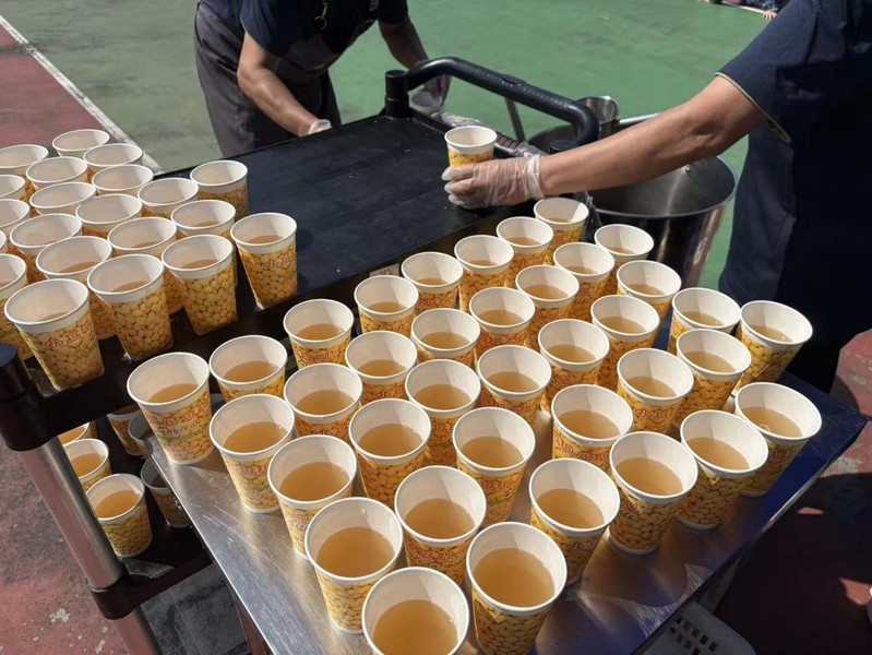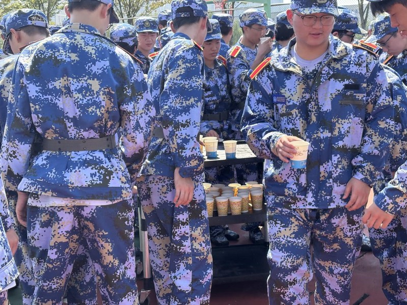 训练的间隙,岸香餐厅的工作人员推着满载纸杯的餐车来到操场。餐车里,一杯杯盛满绿豆汤的纸杯整齐排列,淡黄色的汤汁在阳光下泛着温润的光泽,仿佛能驱散空气中的燥热。