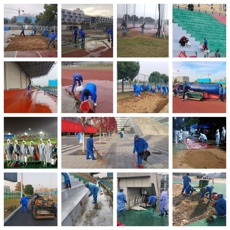 运动会期间,物业保障工作高效有序、无缝衔接。每日清晨六点,当校园还沉浸在静谧之中,保洁人员已准时到岗,沿着跑道、观众席、功能区开展循环保洁,细致清理垃圾与落叶,用辛劳换来了赛场的整洁清爽;工作人员平均每两小时进行一次全场巡检,及时响应各类需求,确保场地环境始终保持最佳状态。期间遇降雨天气,物业人员更是迅速行动、紧急处置,第一时间赶赴现场清理跑道、台阶等区域的积水,全力保障赛事不受天气影响,用速度与责任守护着运动会的顺利节奏。