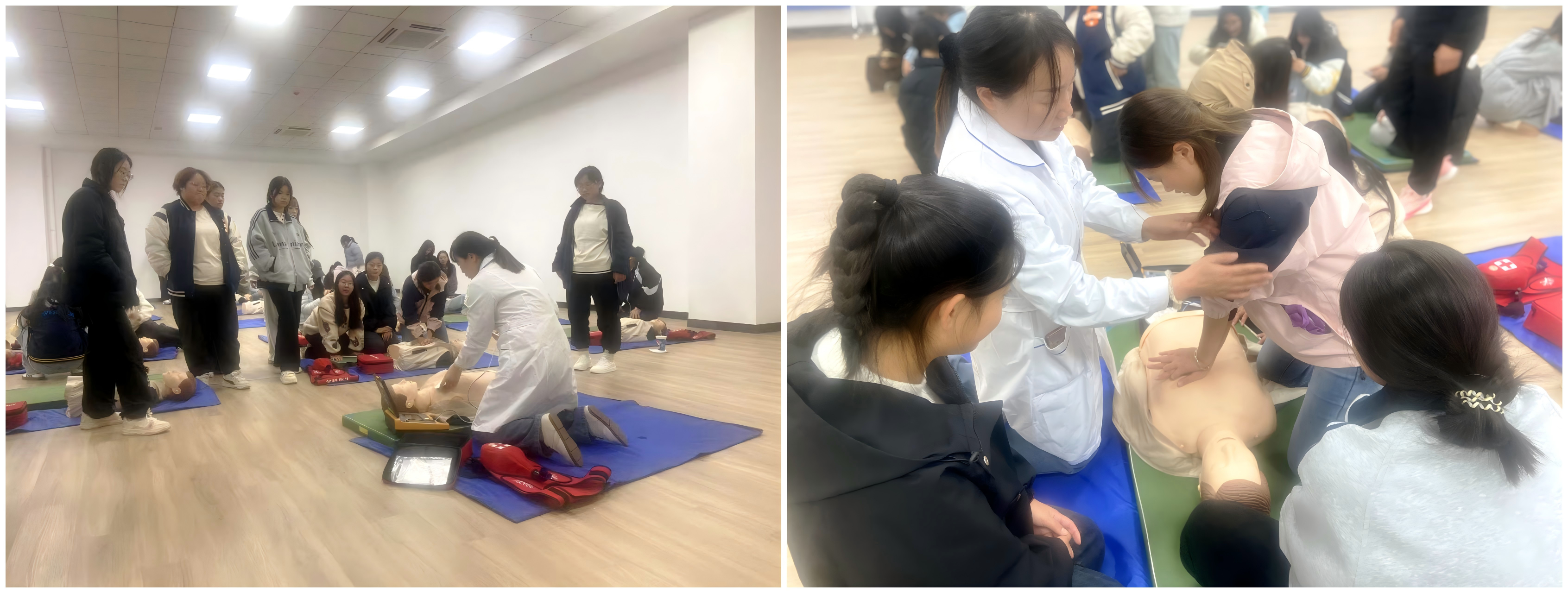 在实操环节,学生分组在模拟人上进行 CPR 和 AED 操作练习,校医团队一对一指导,纠正动作细节。一位位学生在校医指导下调整按压姿势,逐渐掌握节奏,学生纷纷表示:“通过反复练习,发现急救并不神秘,关键时刻敢上手了!”