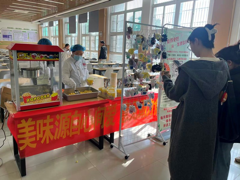 餐厅入口的意见征集点前,师生们络绎不绝。大家分别扫码填写建议。“早餐希望增加杂粮选项”“窗口打饭速度可以再提一提”,一张张卡片上,字里行间满是对餐厅的期待。提交建议后,同学们挑选着可爱挂件,或领取刚出锅的爆米花,奶油与谷物的香气在空气中弥漫。