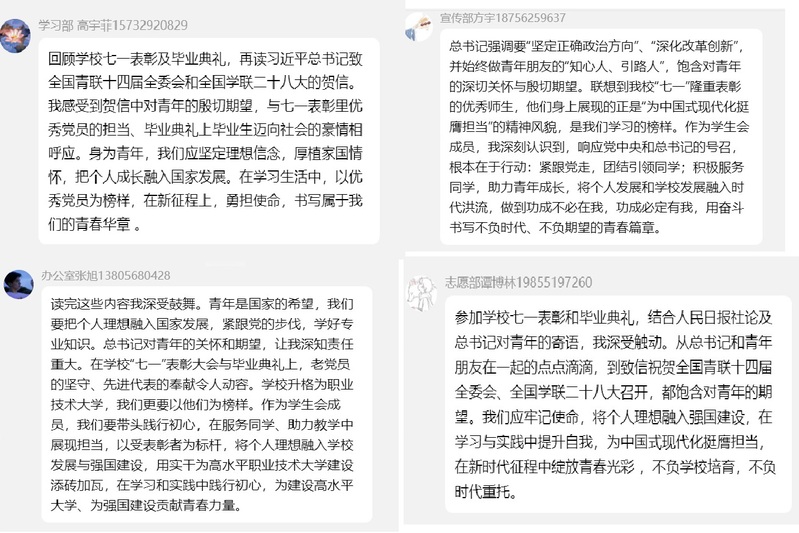 学习会上,团员青年们认真研读习近平总书记的贺信内容。贺信强调,青年要坚定理想信念,培育高尚品格,练就过硬本领,勇于创新创造,矢志艰苦奋斗。同学们深受鼓舞,纷纷表示要牢记总书记嘱托,以更加昂扬的斗志投身学习和实践,为学校职教本科升格更有“格”添砖加瓦