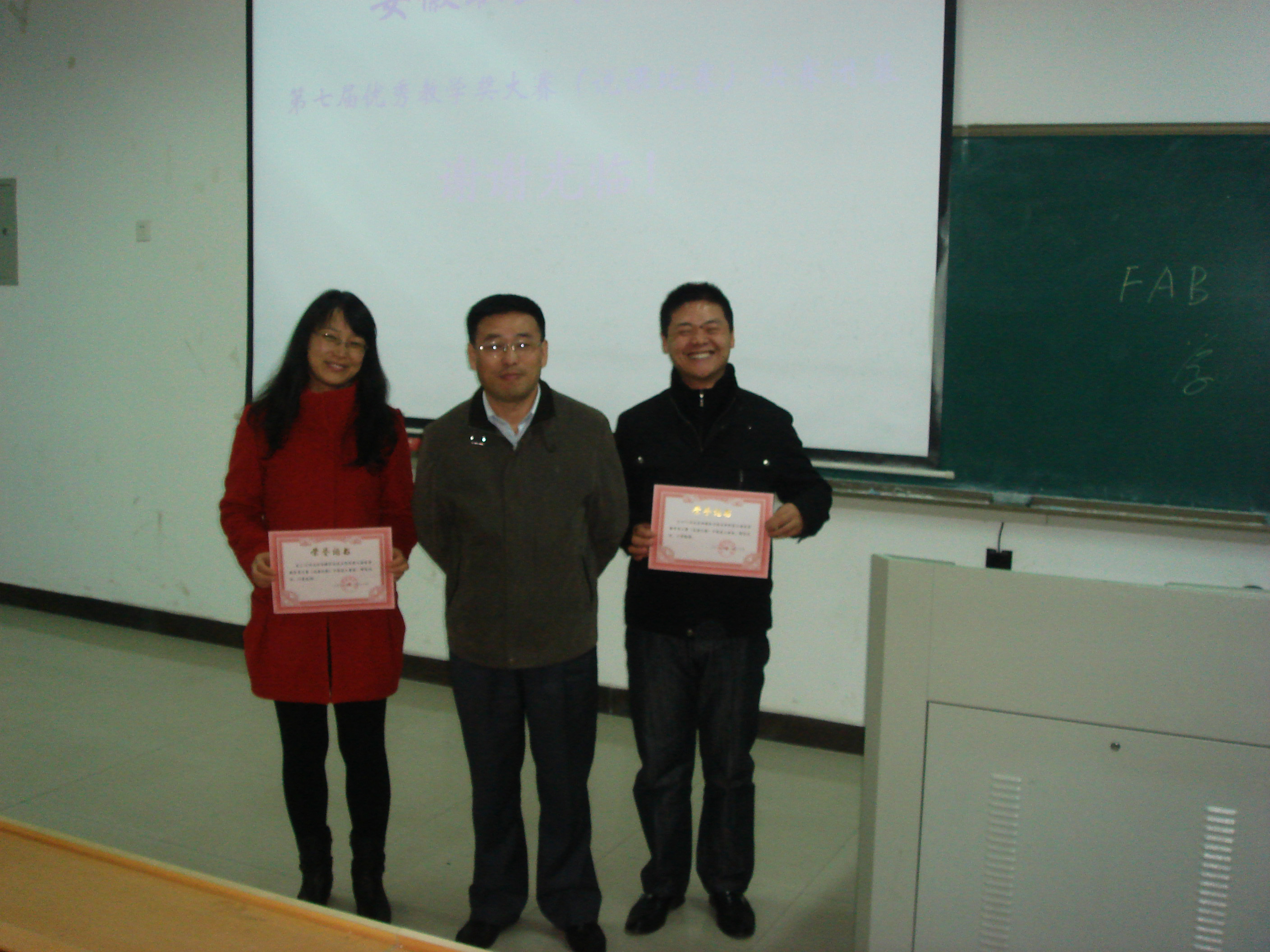 2011年11月30日,由教务处、组织人事处、院工会联合举办的第七届优秀教学奖大赛(说课比赛)决赛在我院顺利完成,经系(部)初赛选拔出来的十七位选手参加了决赛,最终机械工程系张作胜老师荣获个人“一等奖”,材料工程系黄永珍、机械工程系张书诚老师荣获个人“二等奖”,电气工程系常辉、经贸系汪洪斌、管理系方希和胡辉平老师荣获个人“三等奖”。材料工程系获得组织奖“一等奖”,信息工程系获得组织奖“二等奖”,机械工程系和经贸系获得组织奖“三等奖”。