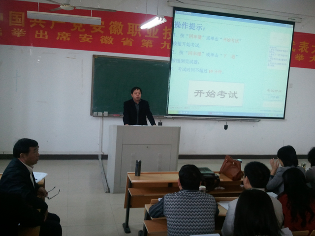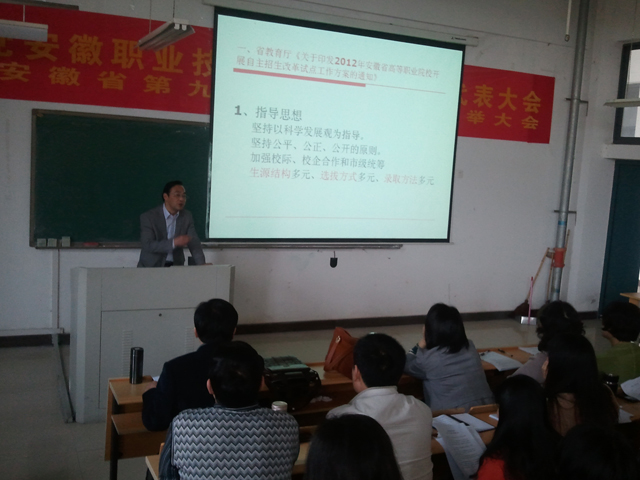 培训会上,院学生处处长陶新南首先传达了省教育厅《关于印发2012年安徽省高等职业院校开展自主招生改革试点工作方案的通知》文件精神,然后介绍学院制定的《安徽职业技术学院2012年自主招生方案》、《安徽职业技术学院2012年自主招生章程》、《安徽职业技术学院2012年自主招生测试方案》。在介绍学院2012年自主招生测试方案面试程序时,陶新南着重说明了学院为了做到自主招生公平、公正,在面试环节采取了“四个随机”,即:考生面试顺序号随机抽签、考生随机抽取考题、测评工作人员分组随机抽签、考场安排随机抽签。