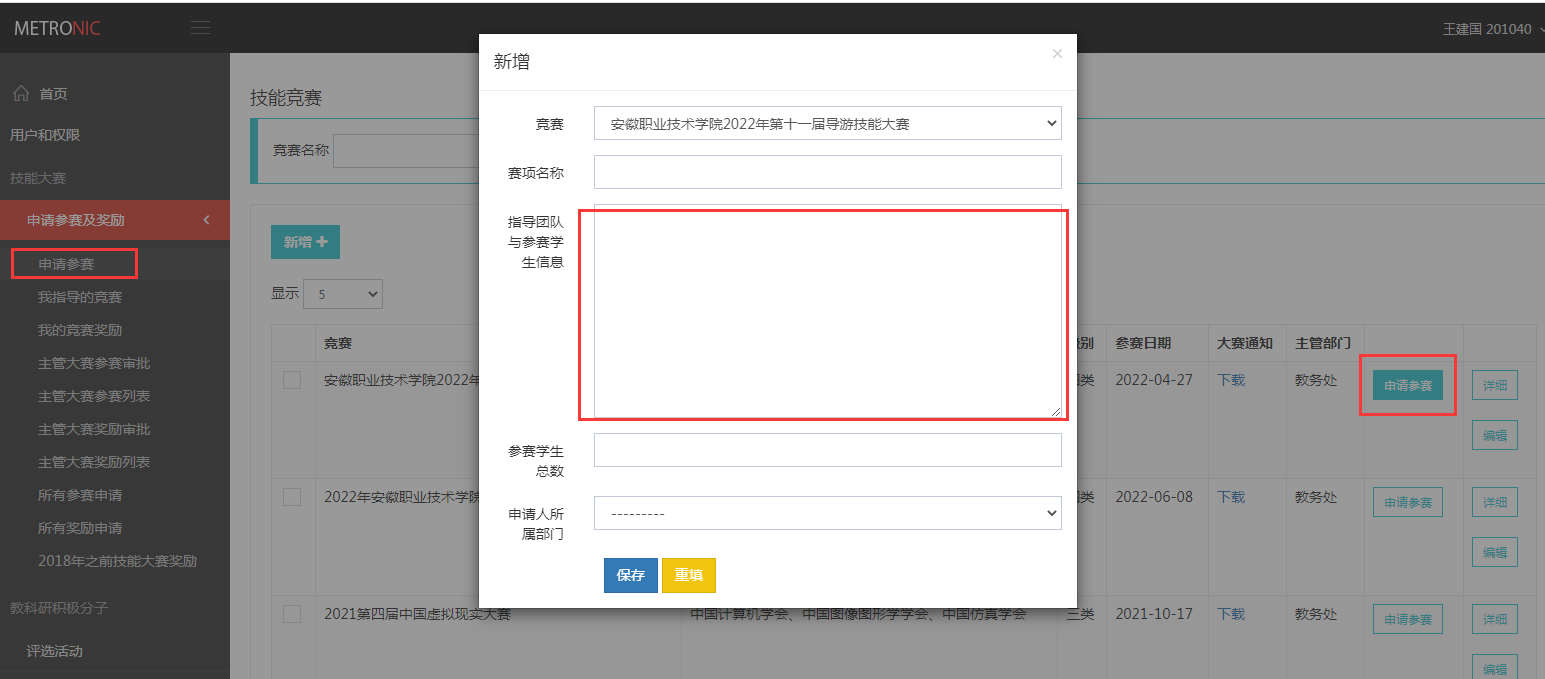 第四步:指导教师通过教务处官网大赛管理栏目登录技能大赛管理系统(/index.html),在申请参赛菜单中找到所要参加参赛信息,点击申请参赛按钮,在弹出的对话框中填写完整参赛信息后提交保存。