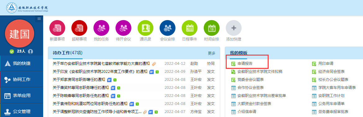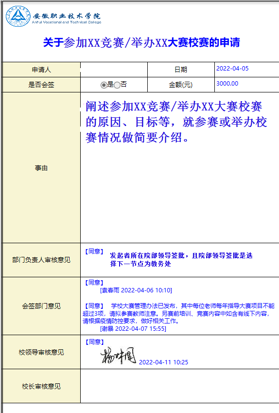 第一步:由指导教师通过OA系统中的申请报告发起申请,对于以安徽职业技术学院名义参加的非学院举办的各级各类技能竞赛,在OA系统提交申请报告时,除上传竞赛相关材料作为附件外,还需上传以院部为单位具体参赛选手和指导教师等参赛团队人员信息(可以表格形式列出参赛队伍信息),院部领导审批通过时选择下一节点为教务处。
